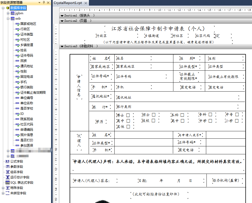 然后就能在右侧DB的字段列表界面中选择并显示所需字段,并将它们拖拽至右侧设计器区域(删除页脚中的重复字符串类型的文本框控件)