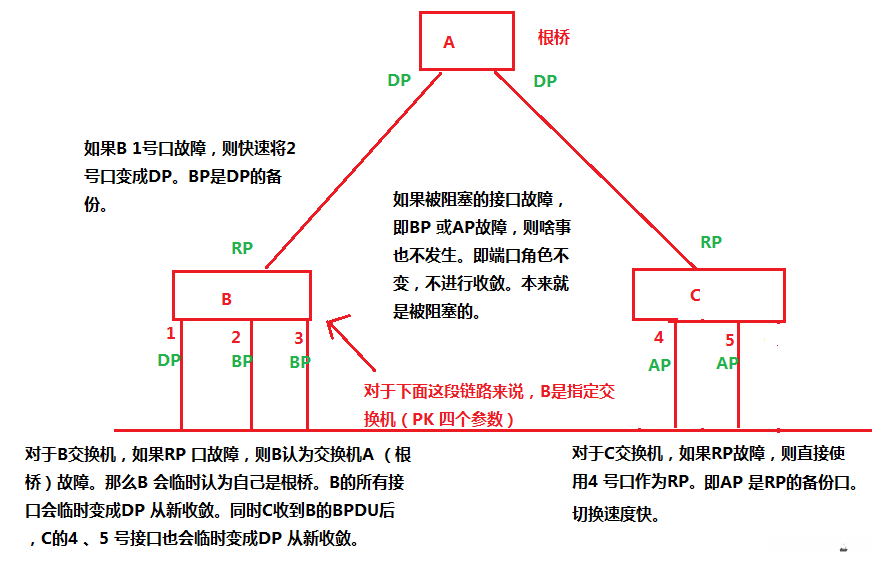 无论何种情况,在同一个交换机内的任何一段链路中都必然会出现 BP 与 DP 这对组合。一旦某个 DP 发生故障,默认情况下默认情况下指定交换机会切换至可用状态的是其对应的 backup BP 即 backup 站点域单元(BPD)。这种关系仅限于特定拓扑结构中的自环节点才会出现的情况所特有的现象。在这种特殊拓扑结构中存在一种称为 self-loop 的设备类型其定义是能够同时发送和接收 BPDU 并能正常接收来自自身其他端口的数据流的存在。