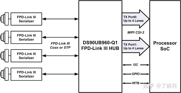 特斯拉采用了三片TI提供的FPD-LINK解码器芯片;这些解码器芯片通常是成对配置的;串行连接一般位于摄像头内部;而解码过程则发生于印制电路板(PCB)上;其兼容型号包括DS90UB系列中的多个版本;该芯片具备四条通信通道(Lane),当采用MIPI CSI-2接口时,则单通道带宽可调节至4Gbps范围内