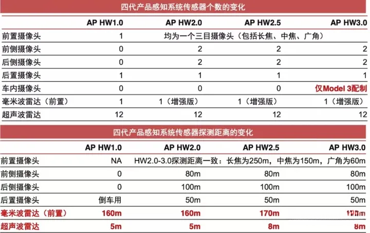 尽管面临高昂的成本挑战,特斯拉仍未能采用激光雷达技术。该页面展示了特斯拉车身上不同版本的传感器硬件配置(如图所示)。其中AP3.0版本采用了6个摄像头、12个超声波雷达及1个毫米波雷达等设备。值得注意的是,在这一配置下,其采用的算法堪称精湛——即使仅依靠超声波雷达配合摄像头也能完成3D数据建模工作。由此实现了性能与成本的双优平衡,并降低了对DDR带宽的需求。