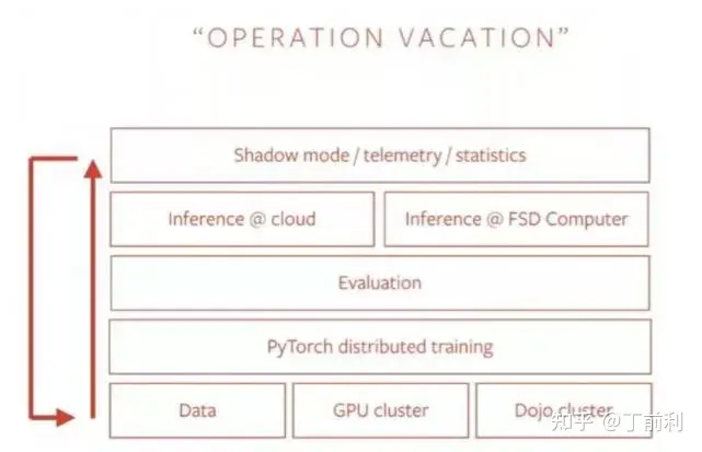 特斯拉开发的视觉方案在算法和计算能力方面达到了极高的复杂度。特斯拉曾经透露过其关于数据流自动化计划的核心目标被称为"OPERATION VACATION";这一目标涵盖的数据流处理流程包括从数据收集到"影子模式"形成了一个完整的闭环;这个闭环不仅包含了从数据训练到评估再到算力优化的过程