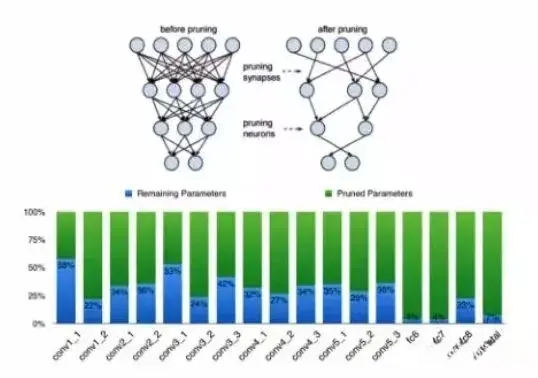 值得特别指出的是:通过查看图表可知, 深度学习神经网络主要包含卷积 layer 和 fully connected layer 两大组成部分, 其中, 剪枝技术在 fully connected layer 上的表现最为突出, 相较于 convolutional layer 来说, 在 fully connected layer 上实现了更为高效的减量。在 column chart 中显示的部分是经过 compression 后的各项 coefficient 占比, 可以看出, 在经过 pruning 处理后, 虽然在 fully connected layer 的数量大幅减少的同时, 在 convolution layer 的 effect 相形之下较为逊色。