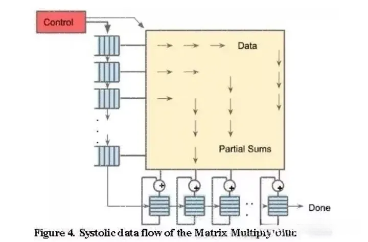 再谈谈AI芯片吧。比如说谷歌那款赫赫有名的TPU1处理器吧。这款处理器性能强劲,在运算方面表现突出。它的核心组件是一个拥有256乘256阵列结构的脉动型计算引擎(如图所示)。这个引擎总共包含64千个独立的核心单元,在单个周期内能够完成128千次运算任务——其中一半是乘法运算另一半则是加法运算这样的高效处理能力让它在AI训练任务中表现尤为出色