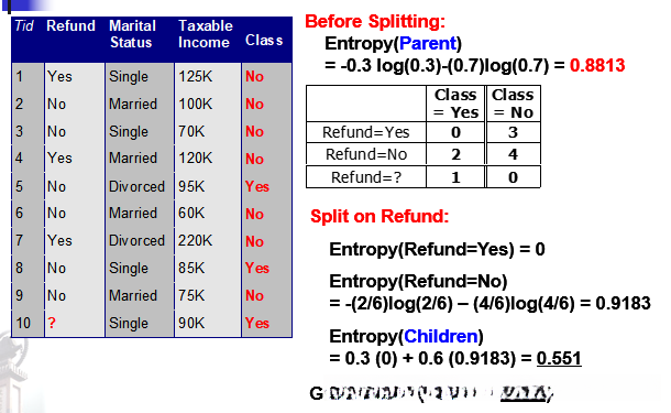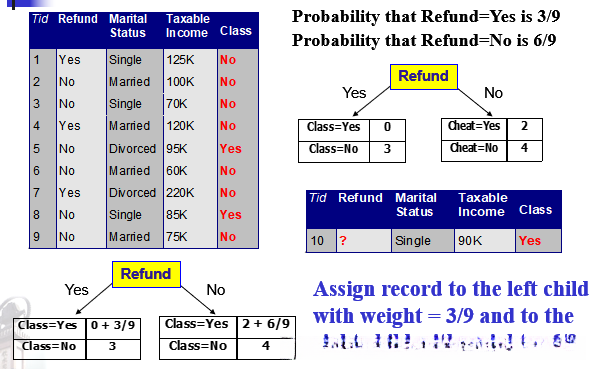 之前不含缺失值的时候是数结点个数,且实例属性确定,因此分实例的时候是整个将其分过去的,但是如果此时我们不知道某实例该属性的取值,就可以按照已经分了的实例比率进行划分,例如上例中refund=yes的比例是3/9,那么第十条实例分到refund=yes的概率就是1/3,而本实例所属类别为yes,因此左结点的yes加上1/3