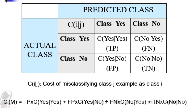 但是使用准确度有一个局限,比如一个不均衡数据集,类别为0的数据有9990个而类别为1的数据有10个,模型不管怎样都将其预测为类别0,那么准确率就高达99.9%,这是很不科学的,所以我们会在混淆矩阵的基础上再加上成本矩阵例如下图所示: