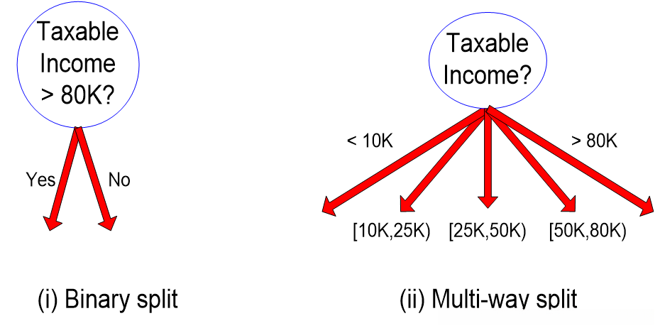 依赖于属性类型(标称顺序连续)和切分方式(二分类和多分类),二分类与多分类的区别如下图: