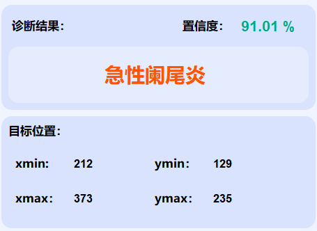 系统通过图像分析技术识别出图片中的腹部阑尾病变,并呈现相应的检测结果。具体包含总目标数量统计、完成时间记录、各类目标分类信息分析、检测置信度评估以及目标精确位置坐标数据。