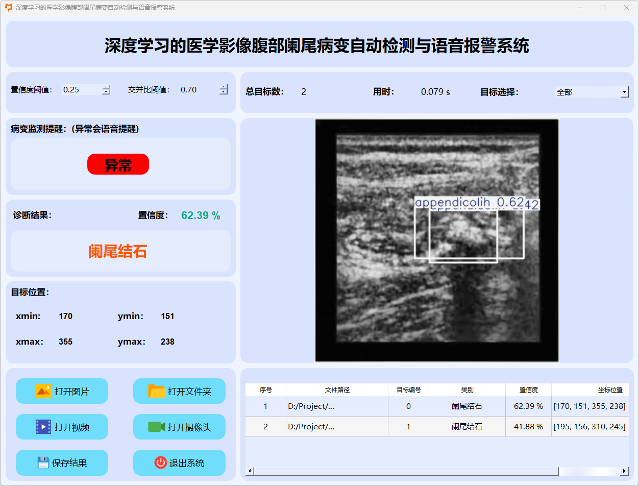 该系统以YOLOv8算法为核心构建了目标检测模型,并具备高效的实时目标检测能力。该系统能够实现对CT或超声波影像中发现的阑尾病变的分类与定位。包含以下五种典型病例类型:阑尾脓肿、急性阑尾炎、阑尾结石、阑尾正常以及阑尾穿孔。通过收集相关病例的数据并对其进行标准化标注处理后,在此基础上基于深度学习算法完成了模型训练工作,并结合PyQt5框架构建了直观友好的操作界面。