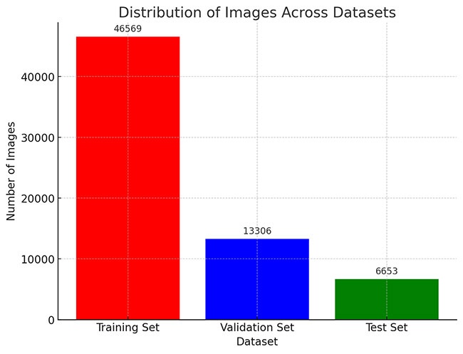 训练数据集包含46569张图像,并参与模型训练与参数优化过程。验证数据集包含13306张图像以检验模型对新样本数据的学习效果,并防止过拟合现象的发生。测试数据集包含6653张图像通过评估模型在未知数据集上的表现来衡量其泛化性能