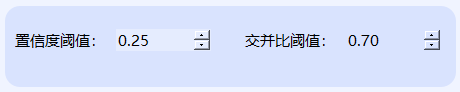 (2)交并比阈值:当前设置为0.70,表示系统只会认为交并比(IoU)超过70%的检测框为有效结果。交并比是检测框与真实框重叠区域的比值,用于衡量两个框的相似程度,值越高表明重叠程度越高。