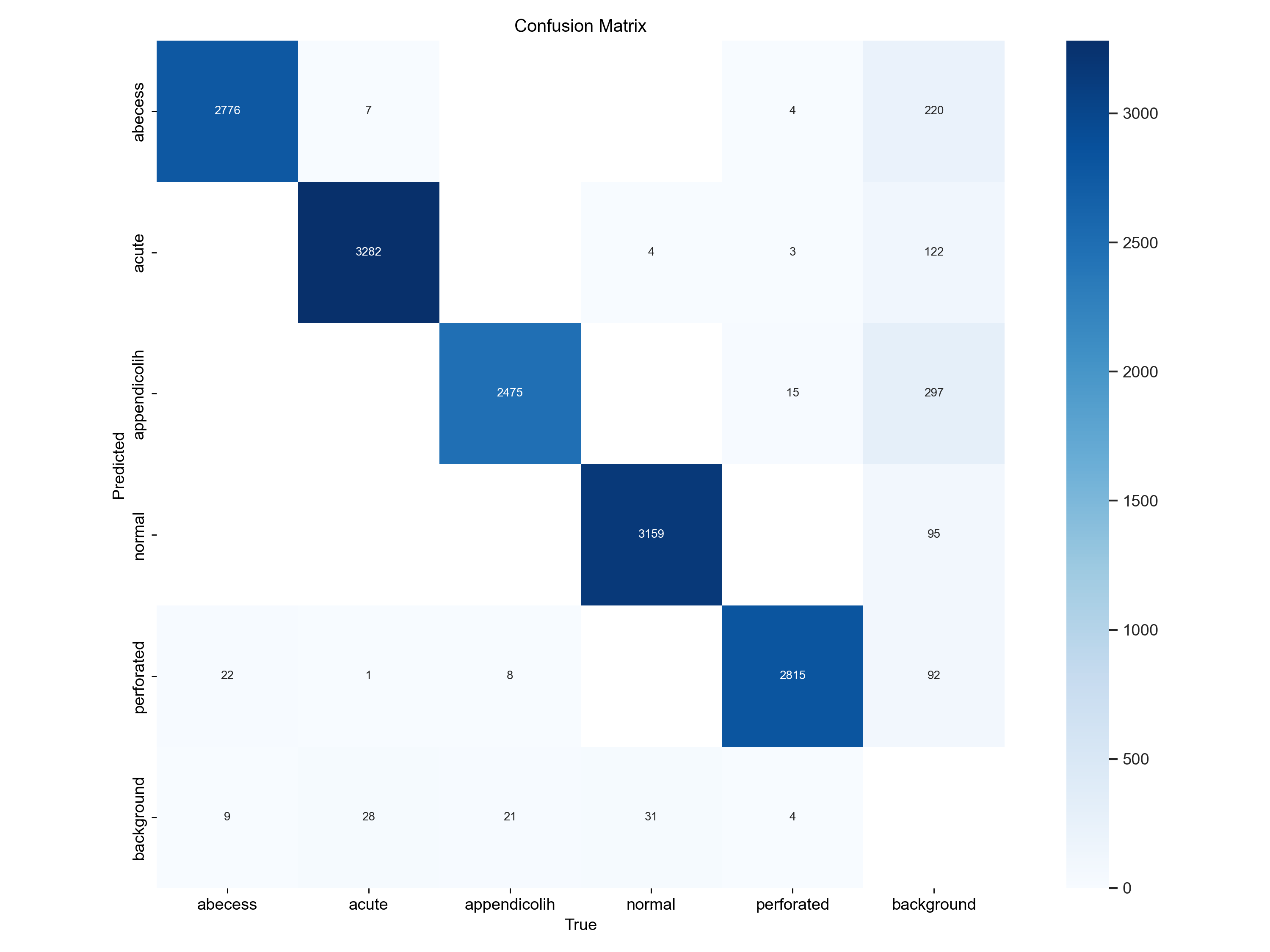 结论:针对阑尾病变检测任务而言,在整体性能上该模型表现优异,并能较为准确地区分大部分类别;然而,在背景类及相近类别之间仍存在一定程度的误分类现象。