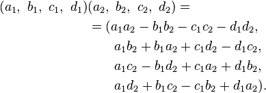 Axis-Angle的表示方法还可以推导出另一种很常用的三维旋转表示方法,叫四元数(Quaternion),这里有一篇非常通俗易懂介绍四元数的文章。同上,假设(x,y,z)是axis方向的单位向量,theta是绕axis转过的角度,那么四元数可以表示为**[cos(theta/2), xsin(theta/2), ysin(theta/2), z*sin(theta/2)]** 。注意,这里可以推导出,用于表示旋转的四元数向量也必须是单位向量。四元数的神奇之处在于,对于三维坐标的旋转,可以通过四元数乘法直接操作,与上述旋转矩阵操作可以等价,但是表示方式更加紧凑,计算量也可以小一些。首先,四元数的乘法是如下规定的: