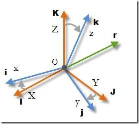 此外,在陀螺力学领域较为常见的另一种表示三维空间中物体旋转变换的方式被称为**方向余弦矩阵(Direction Cosine Matrix)** ,简称DCM(Direction Cosine Matrix)。这一名称来源于以下原理:当刚体处于初始姿态时(即起始朝向),其三个坐标轴方向分别为I、J、K;而当刚体处于目标姿态时(即当前朝向),其三个坐标轴方向则分别为i、j、k。那么该空间变换可通过刚体绕三个不同轴线分别转过的角度来描述。(如图所示)