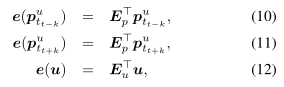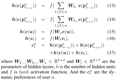 这里1 \leq k \leq w, w是窗口宽度, E_p \in \mathbb R^{M \times d}和E_u \in \mathbb R^{N \times d}表示POIs和users的嵌入矩阵,d是嵌入向量的维度。