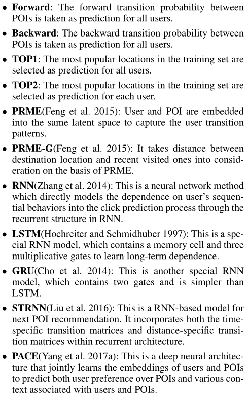 具体思路 :1.首先利用POIs的双向全局空间和局部时间信息来捕获复杂的依赖关系。2.结合用户和POI信息,将目标时间模式输入到一个多层网络中,捕获用户的动态偏好。3.将动态偏好转化为与依赖关系相同的空间,形成最终模型。