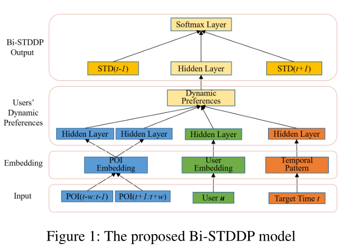 基于此,我们建立了一个结合双向时空依赖和用户动态偏好的模型Bi-STDDP,来识别用户在特定时间访问的缺失的POI签到。