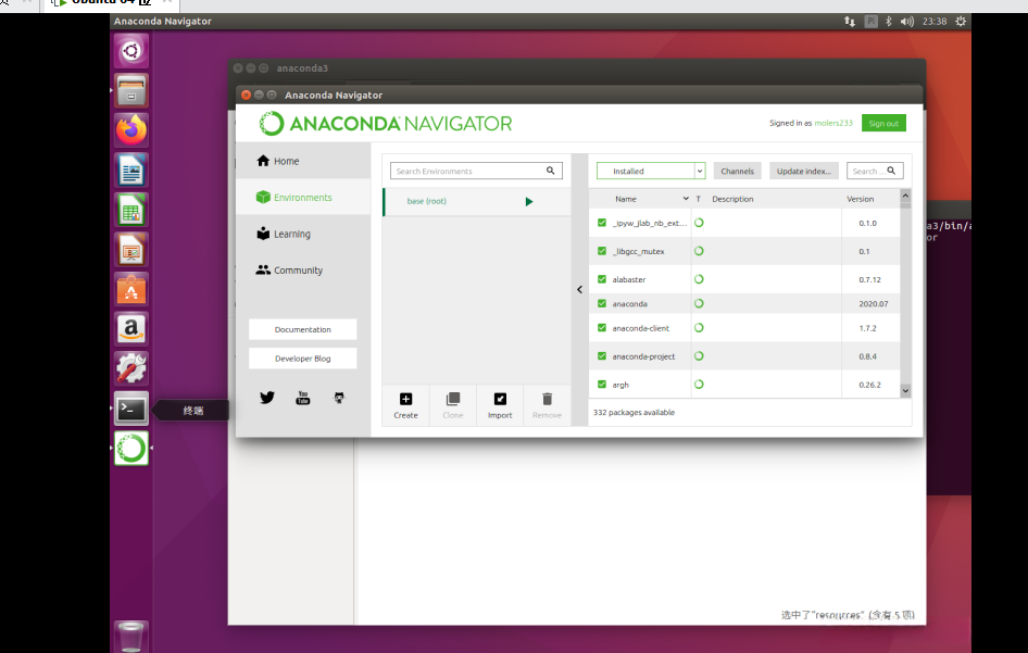 出现anaconda图形界面加载一会儿,就可以将其添加到任务栏或收藏夹上,下次可直接点击该图标即可实现可视化anaconda图形界面的操作。