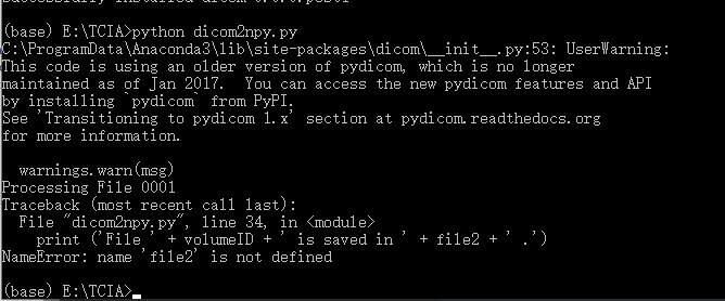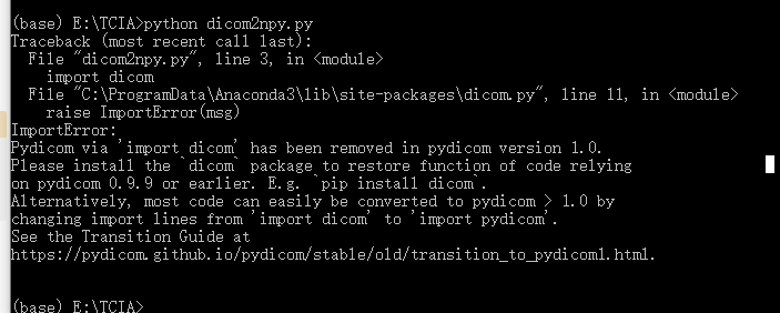 ImportError:通过“import dicom”的Pydicom已经在Pydicom 1.0版本中被删除,请安装dicom包来恢复依赖于Pydicom 0.9的代码的功能或更早。例如,pip install dicom交替,大多数代码可以轻松转换为pydicom>1.0通过改变import 1ines从import dicom到import pydicomiSee过渡指南