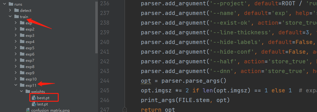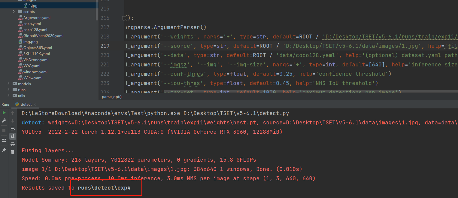 训练完成后会提示保存权重文件,随后找到最佳权重并下载detect.py文件,设置推理函数后选择待检测图片路径,最后运行detect.py即可完成检测任务。
