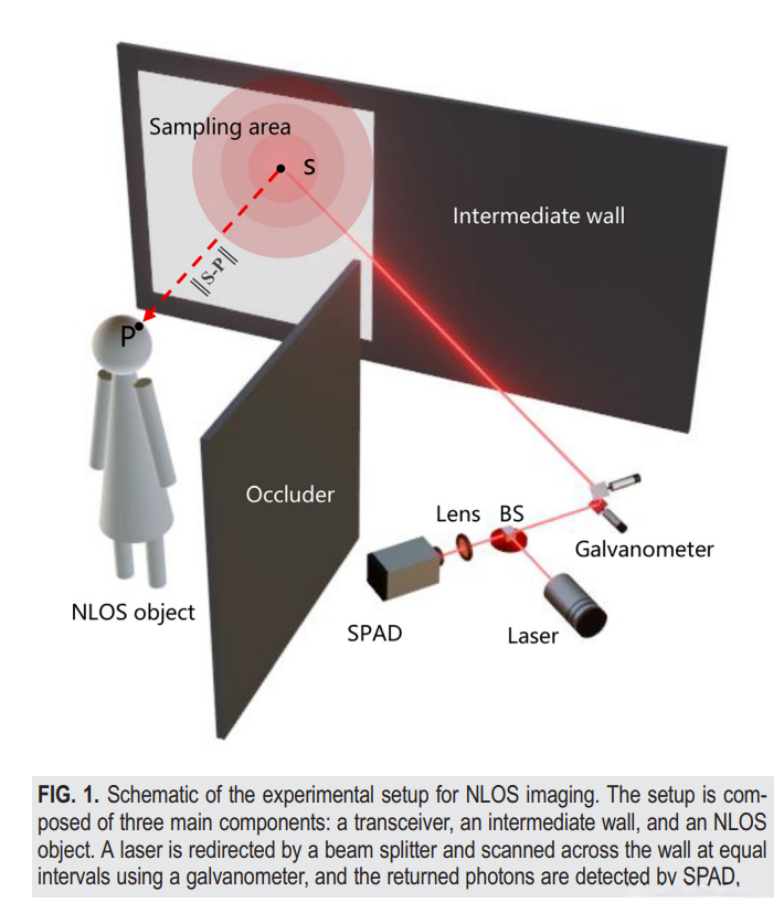 非视距成像是当前计算成像领域的重点方向之一;通过研究光线穿过障碍物后的传播途径来恢复隐藏物体的信息,并实现了对障碍物的有效观察。典型的非视距成像系统主要由激光器、中间反射面和目标设备组成。利用光栅扫描技术,在墙上捕捉到各个位置上的光线飞行时间数据,并形成了关于目标三维结构的信息库。这些数据中包含了目标经过三次散射所释放出的能量信号,在算法处理后就能重构出隐藏物体的具体图像信息。