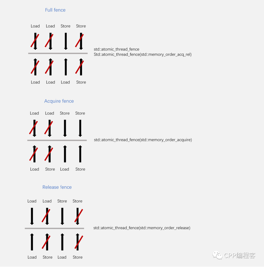Full fence: 阻止两个任意操作乱序。memory_order_seq_cst或memory_order_acq_rel。