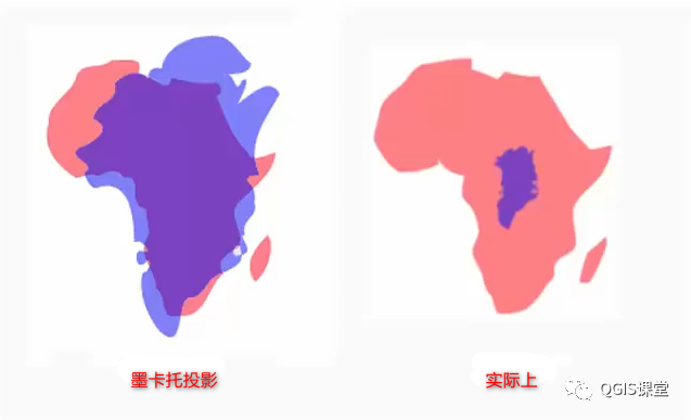 投影变形最典型的实例是在墨卡托投影下,格陵兰岛的面积大致与非洲相当。具体而言,在这种投影下,格陵兰岛的实际面积仅占非洲总面积的十四分之一左右(相当于一个中等大小的国家)。