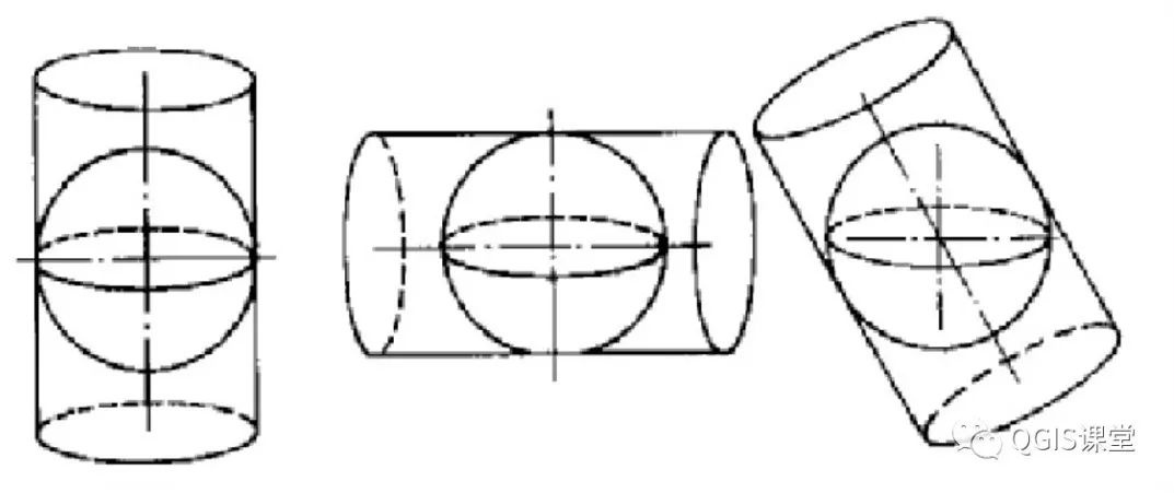 斜轴方位投影即为投影面与地轴呈斜角相交;而斜轴圆柱投影以及斜轴圆锥投影则指其对应的圆柱轴和圆锥轴均与地轴呈斜角相交。