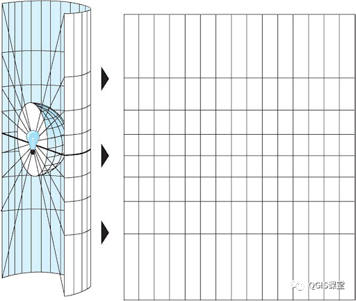 将地球的经纬线网投射至设定的圆柱面上,并沿所选经线切开展开成平面,则可完成圆柱投影。