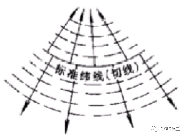 假定选择一个合适的参数设置使得圆锥面与地球体相切或相割,在这一前提下实现球体表面的经纬线网络按照特定投影方式投射到圆锥面上;接着沿选定的一条经线将其展开成为平面图形。