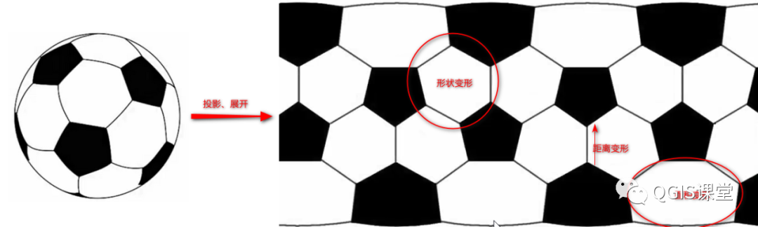 从几何学角度看,球面是一个不能展开的曲面;将其摊平至平面必然会带来裂痕与褶皱现象;这会导致地理物象和地理形态变得断裂而不完整;就像用剪刀撕裂一个足球所呈现的那样多种断裂点遍布表面一样