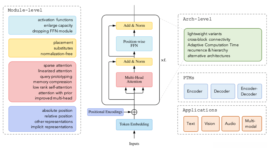 到目前为止,在针对三个维度的前提下提出了基于原版 Transformer 的多种模型:包括架构优化方案、预训练策略以及应用领域