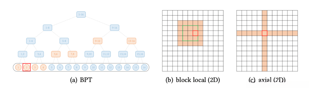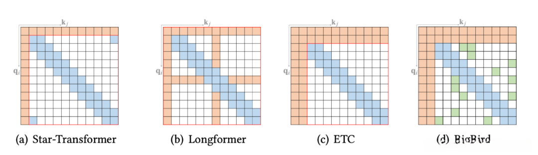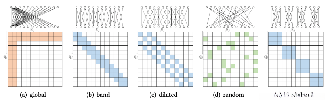 原子稀疏注意力:包括全局关注机制(Global attention mechanism)、带状关注机制(Banded attention mechanism)、伸展关注机制(Dilated attention mechanism)、随机关注机制(Random attention mechanism)以及块状局部关注机制(Block-wise local attention mechanism)。