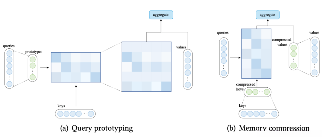 除了采用稀疏化注意力机制或基于内核设计的线性注意力之外,在减少查询数量或键值对数量的基础上也能有效降低注意力计算的复杂度程度;这种策略从而导致了生成查询原型以及进行内存压缩的技术方案。