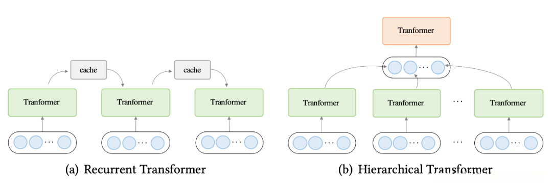 自注意力机制在序列长度维度上的二次复杂度显著地限制了某些下游任务的能力。例如,在语言建模中通常需要处理远程依赖的上下文关系。另一种有效的长序列处理方法是分治策略:在该策略下, 输入序列被分解为多个子序列, 并通过Transformer或其模块进行高效处理。我们识别出两类具有代表性的方法:循环型Transformer和分层型Transformer(如图所示)。这些技术本质上是将Transformer组件封装起来的应用。