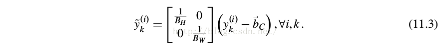 Given that the joint coordinates are situated in absolute image coordinates, it stands to reason that normalizing them with respect to a box B encompassing the human body or portions thereof would prove advantageous. Such a box is defined by its center b_C, height B_H, and width B_W.