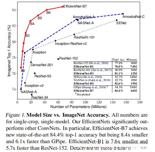 EffificientNet是由谷歌公司推出的最新神经网络模型。本文主要针对现有的先进模型进行了模型缩放方面的深入研究,并在此基础上开发出了EffificientNet。通过一系列实验验证,在ImageNet数据集上采用EfficientNet-B7架构的模型取得了优异成绩:在top-1准确率上达到88.4%,top-5准确率更是高达97.1%。与当前性能最优的ConvNet架构(如GPipe)相比,在计算效率方面提升了约6.1倍,在参数规模缩减方面则实现了8.4倍的优化。