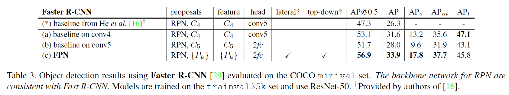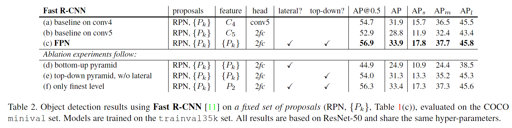 表2(d)和(e)展示了移除top-down和横向连接的效果,稍微低于baseline‘。值得注意的是,移除了top-down,AP下降严重,这表明Fast R-CNN对于在高分辨率图使用低等级特征效果很差。