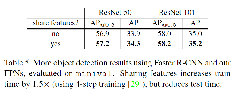我们注意到heads的参数在所有的特征金字塔等级上是共享的,我们同样评估了一个不共享的模型,取得了相似的准确率。共享参数的模型取得的好的效果表明了我们金字塔的所有等级有着相似的语义等级。