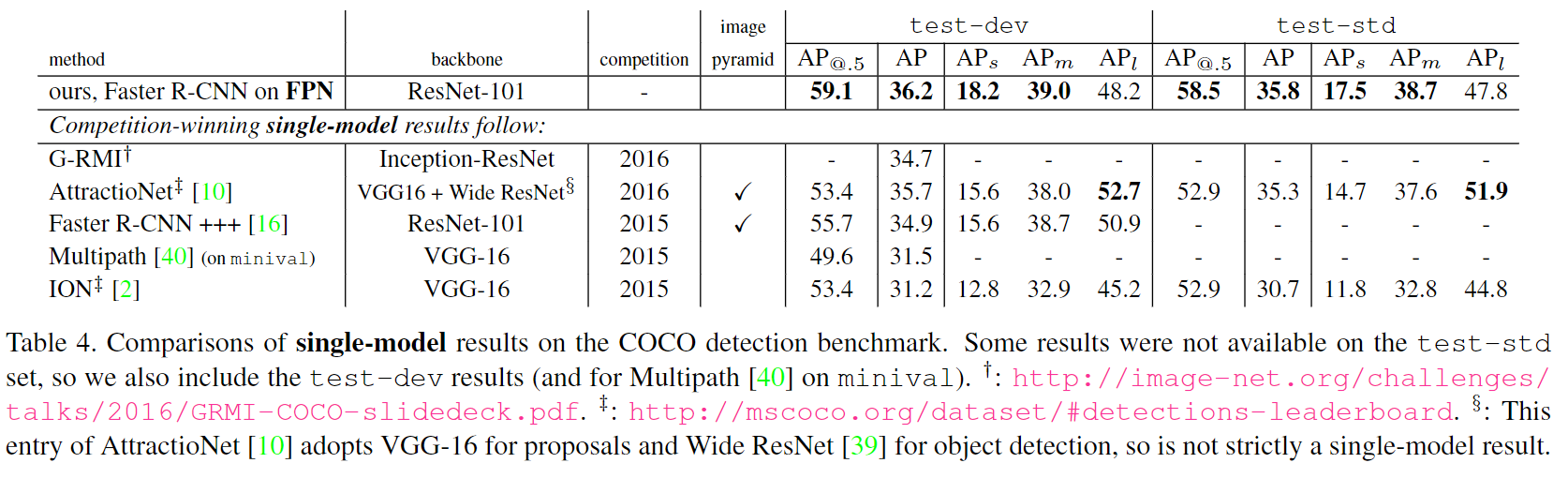 而且,我们方法不需要使用许多流行的改进,比如hard negative mining、context regression、更强的数据增强等。这些方法可能会进一步提升FPN的效果。