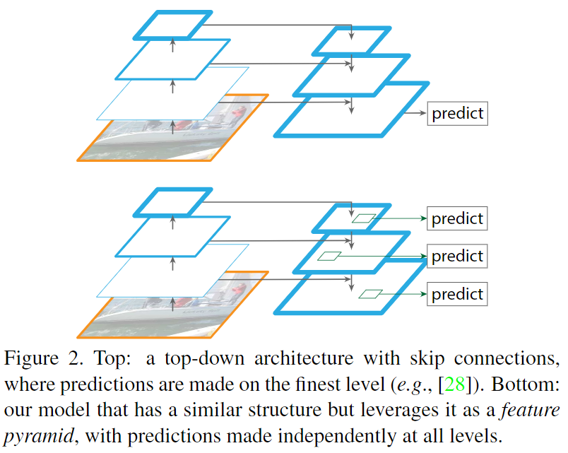 一些使用top-down和跳跃连接的相似结构在最近研究中比较流行。他们的目标是生成一个单个的、有着好分辨率的高等级特征图,在这个图上进行预测(图2上)。相反,我们方法在金字塔的每一层独立进行预测(图2下)。
