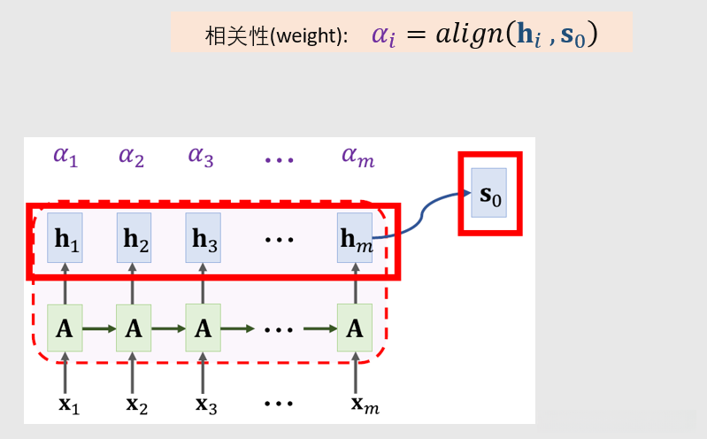 在encoder输入完最后一个状态向量hm时,decoder与attention会同时开始工作,计算s0与每一个状态h1h2....hm的相关性,用公式(下图给出)计算,结果记为ai