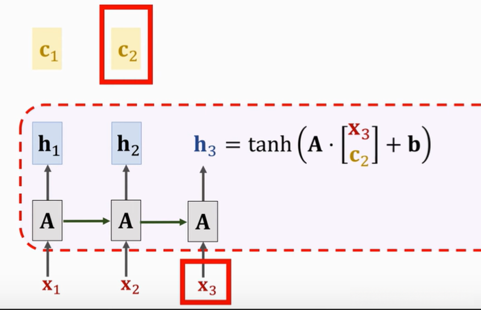 s2算出来后需要计算c2 ,首先需要s2与encoder中h1h2...hm相关性(用上面提到的公式),计算出新的权重a1,a2....am,然后根据公式c2=a1h1+a2h2+...amhm得到c2