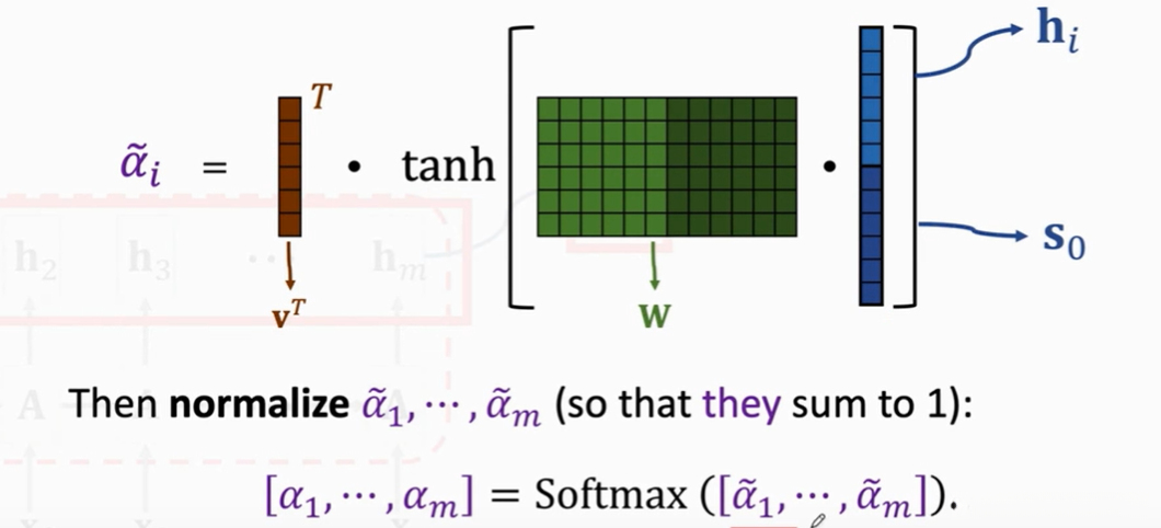 将hi 与s0做内积,得到更高维向量与矩阵W相乘,结果是一个向量,将该向量送入tanh函数,得到新向量每一个值在[-1 ,1],再将结果乘向量V,(W和V都是参数),最后a1...am送入softmax函数得到的向量中每个值>0,所有和仍为1