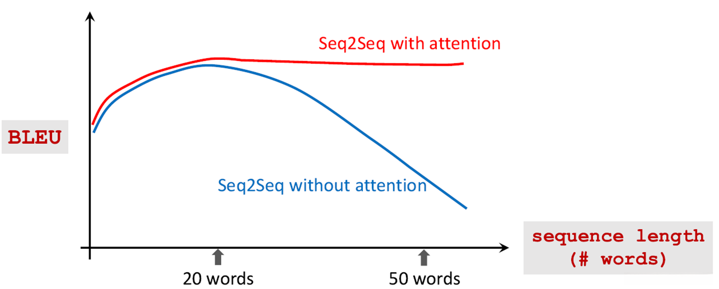 下图横轴是输入得句子长度,纵轴是模型评价值,BLEU越高说明翻译越准确,可以看到,当字数很长时,翻译得准确率就会降低