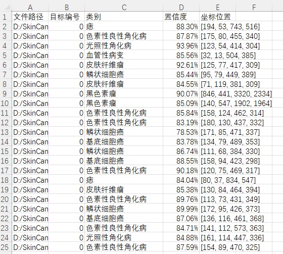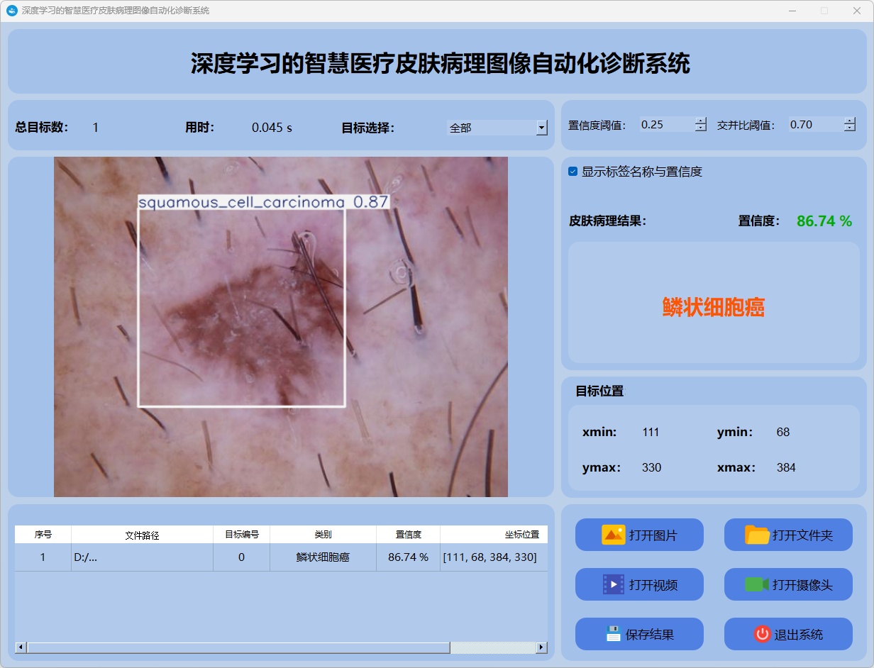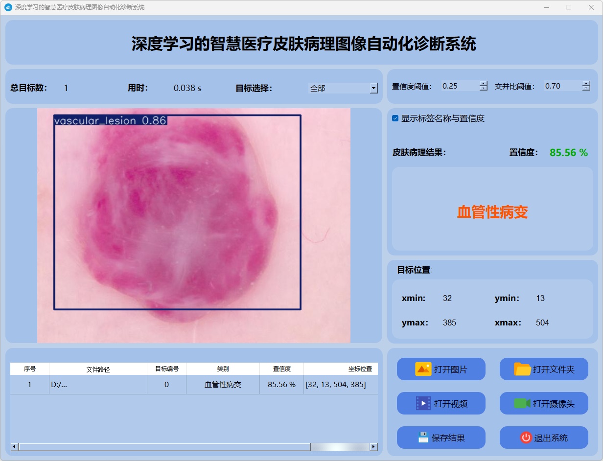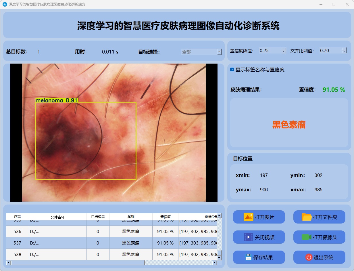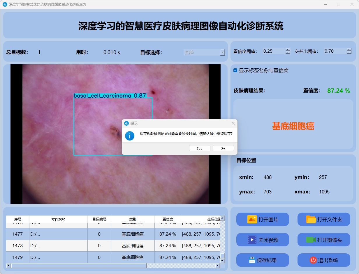 检测结果:系统对视频进行实时分析,检测到皮肤病理图像目标并显示检测结果。表格显示了视频中多个检测结果的置信度和位置信息。