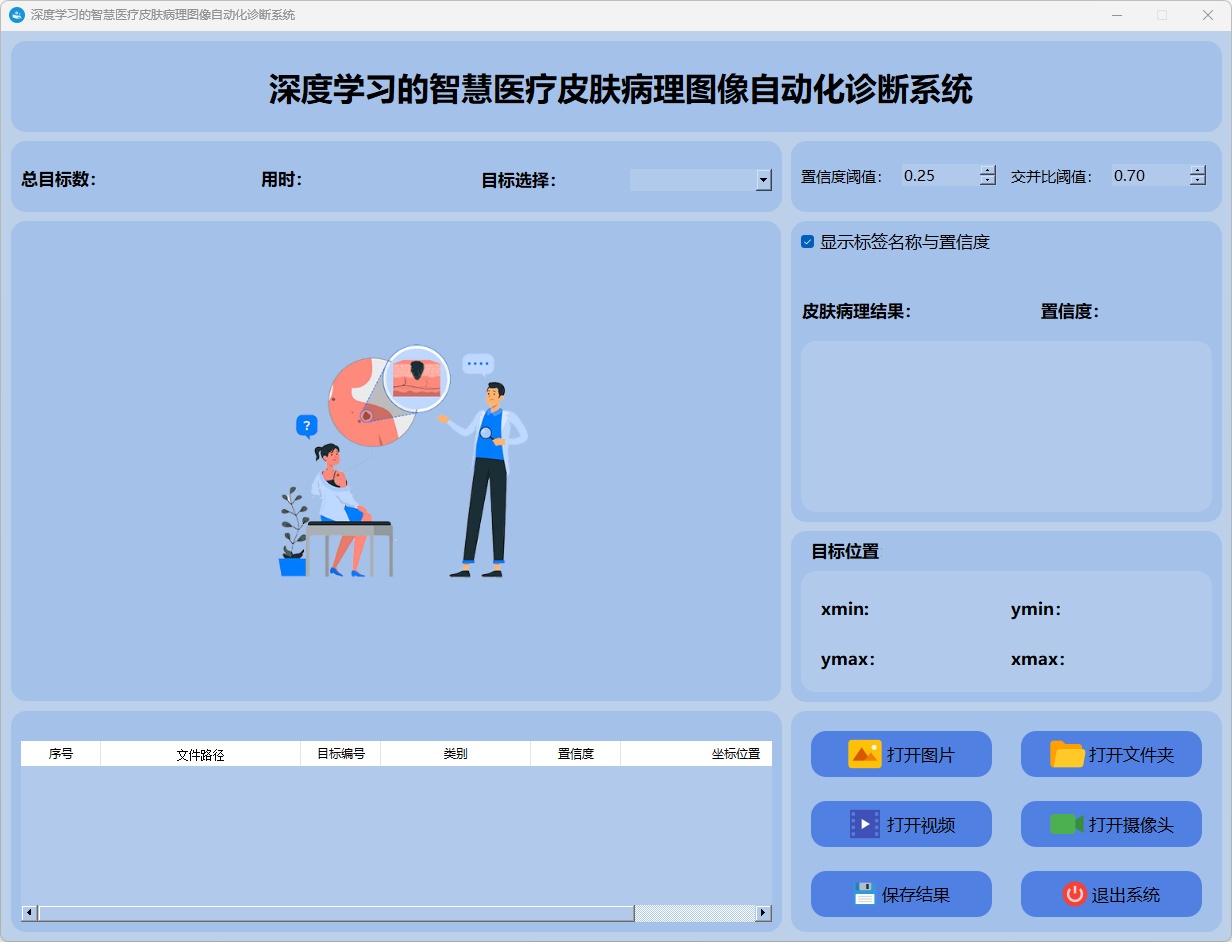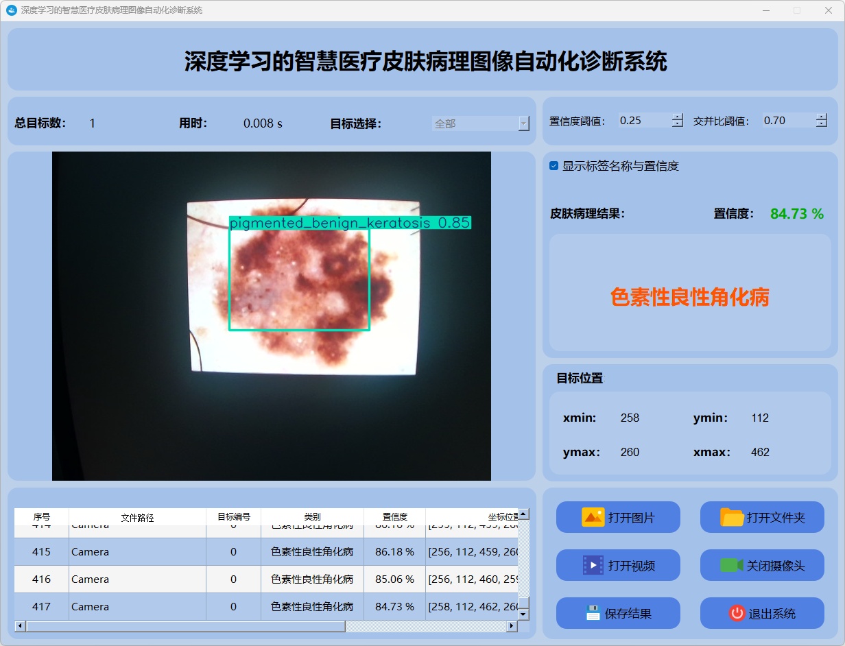 检测结果:系统连接摄像头进行实时分析,检测到皮肤病理图像并显示检测结果。实时显示摄像头画面,并将检测到的行为位置标注在图像上,表格下方记录了每一帧中检测结果的详细信息。