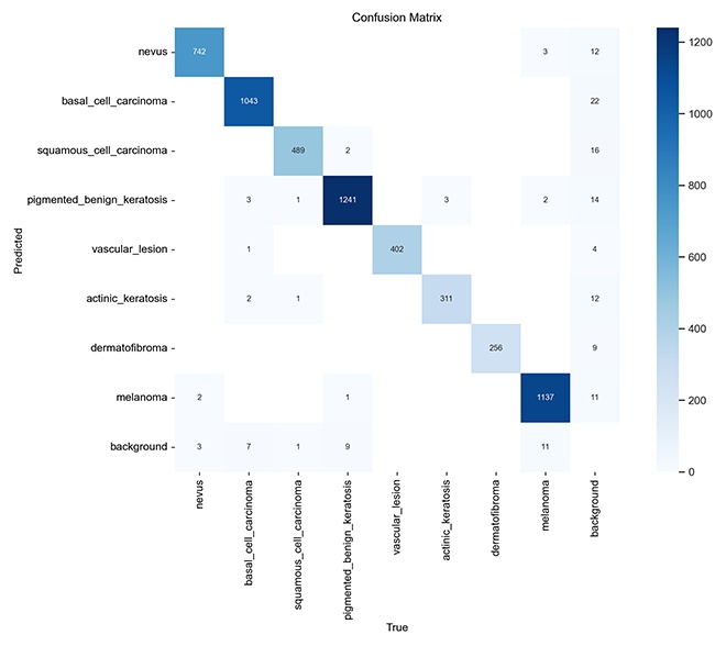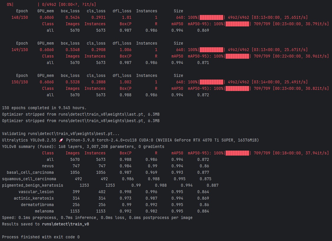 YOLOv8模型在 NVIDIA RTX 4070 Ti 上表现卓越,性能指标优异,非常适合实际应用。系统的实时检测速度和高精度使其适用于智慧医疗中的皮肤病理图像自动化诊断场景。