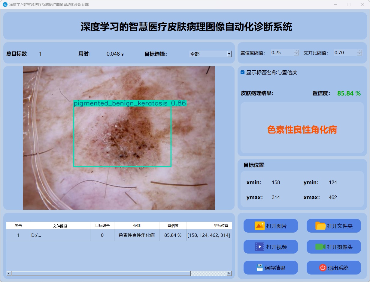检测结果:系统识别出图片中的皮肤病理图像目标情况,并显示检测结果,包括总目标数、用时、目标类型、置信度、以及目标的位置坐标信息。