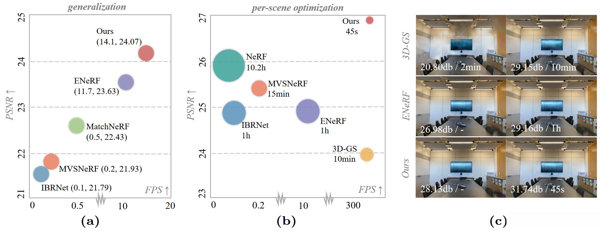 (c) We illustrate a scene (“room”), showcasing the (PSNR/optimization time) of synthesized views, with**"-"** indicating results from direct inference using the generalizable model.