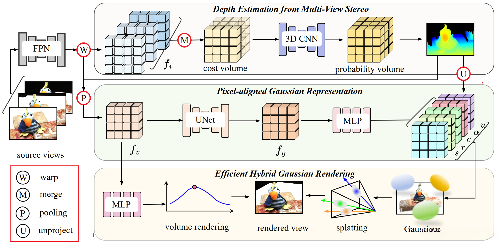 using FPN. These features are then aggregated into a cost volume , regularized by 3D CNNs to produce depth. Subsequently, for each 3D point at the estimated depth , we use a pooling network to aggregate warped source features , obtaining the aggregated feature